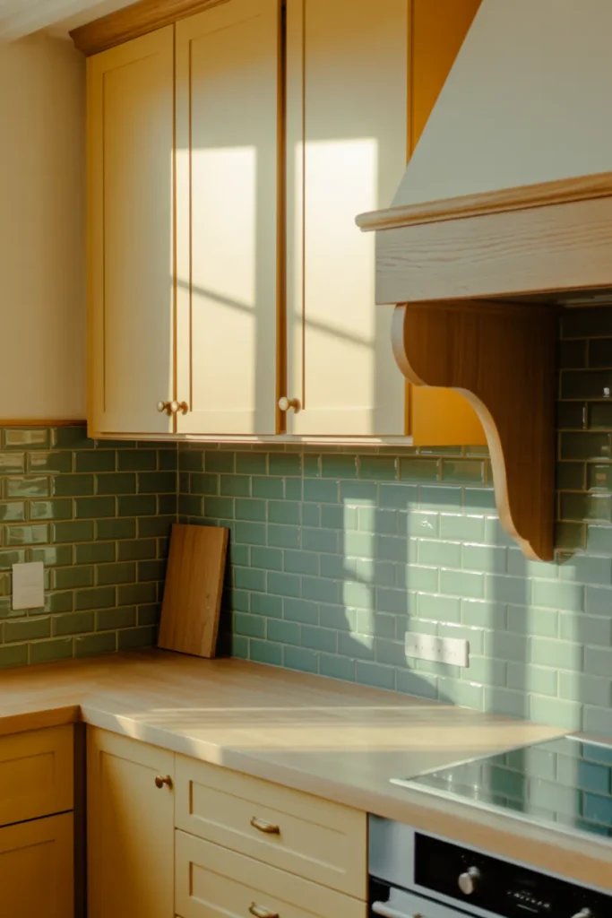 A serene Aesthetic emerges when Soft yellow cabinetry meets a subtle Green and Backsplash. The combination feels earthy yet bright, bridging nature and warmth in a way that’s easy to live with every day.