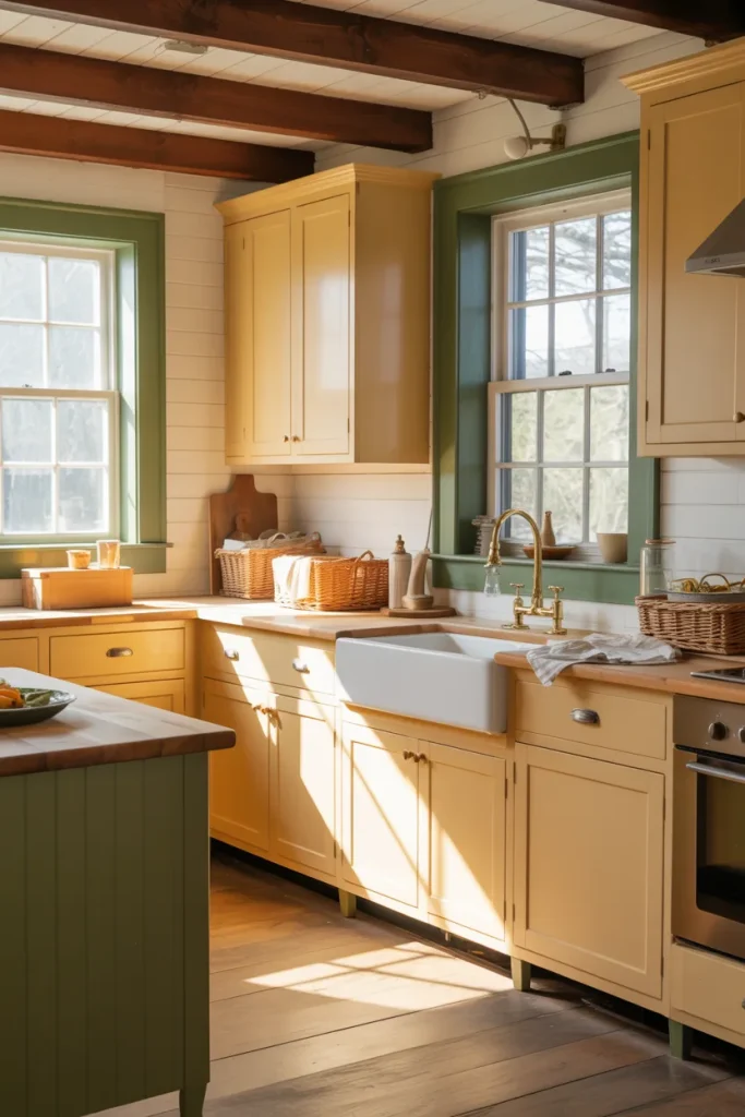 A rustic Aesthetic comes alive when mellow yellow meets sage Green and creamy Cabinets. This pairing feels grounded and natural, especially in farmhouse-style kitchens with apron sinks and wood beams. It bridges countryside charm and modern simplicity.
