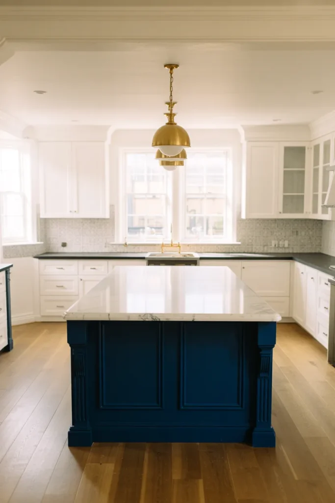 A bold Navy and island continue to dominate white kitchen 2026 inspiration boards. Crisp white walls and layered Backsplash ideas in subtle patterns add dimension. Paired with bright Countertops and thoughtful Design details: the contrast feels intentional rather than trendy.