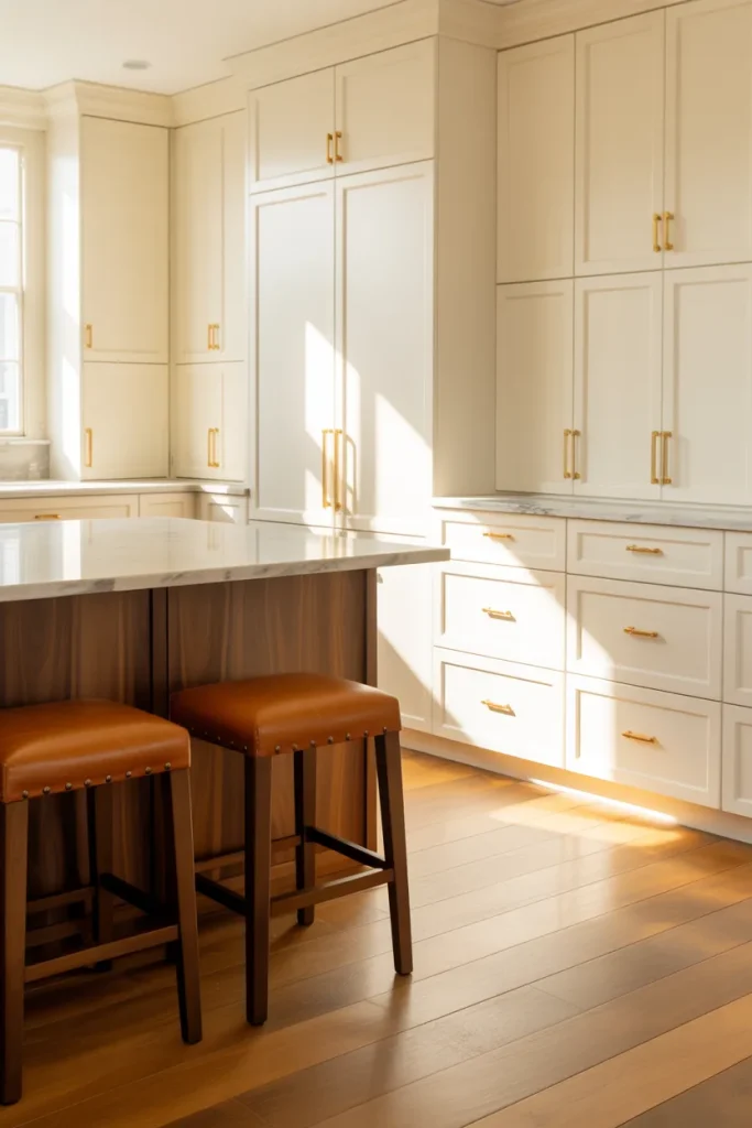 Layering Walnut and darker woods into a white base introduces richness. Pair creamy cabinetry with Brown leather seating and sleek Countertops for a refined contrast. These white kitchen 2026 Ideas feel timeless yet updated.