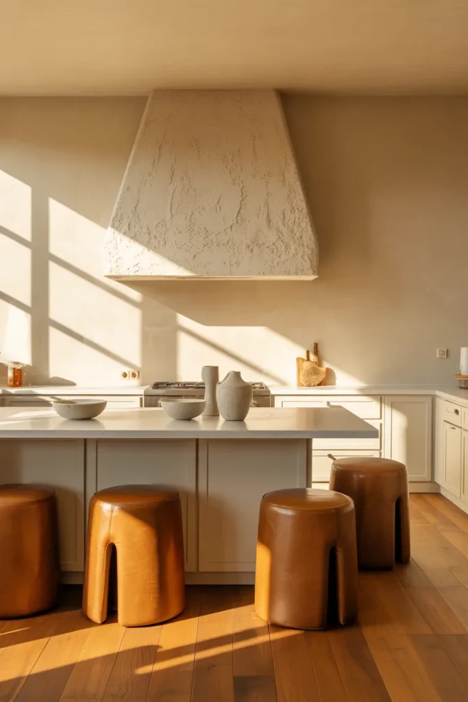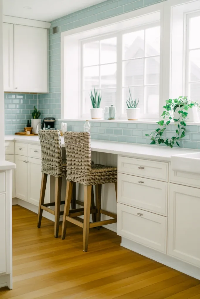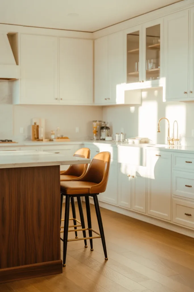 Budget angle: you don’t need to repaint cabinets to achieve this look. Swapping stools, textiles, and small decor accents can shift the entire mood for a fraction of a renovation cost.