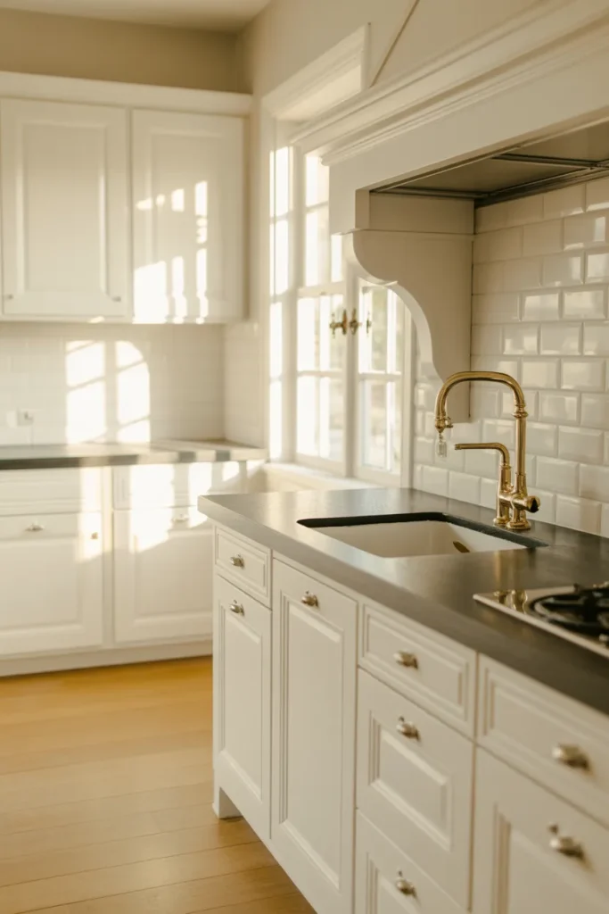 Designers often note that contrast is what keeps white kitchens from feeling bland. A darker counter or faucet instantly adds depth. The key is restraint: limit black elements to two or three focal points so the space feels curated, not heavy.