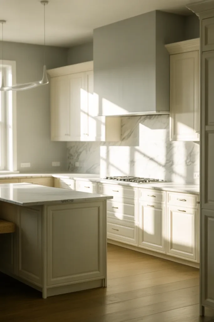 Combining Gray and cool undertones with bright white cabinetry creates a sleek yet welcoming kitchen. Pair soft gray walls with white fronts and layered Tiles for dimension. This blend of Classic and contemporary suits many American homes.