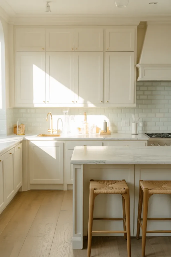 An All-white scheme doesn’t have to feel flat. In the white kitchen of 2026, layered Backsplash textures and subtle Gray undertones create depth. Add sculptural lighting and refined Decor pieces to keep the space visually interesting without sacrificing simplicity.