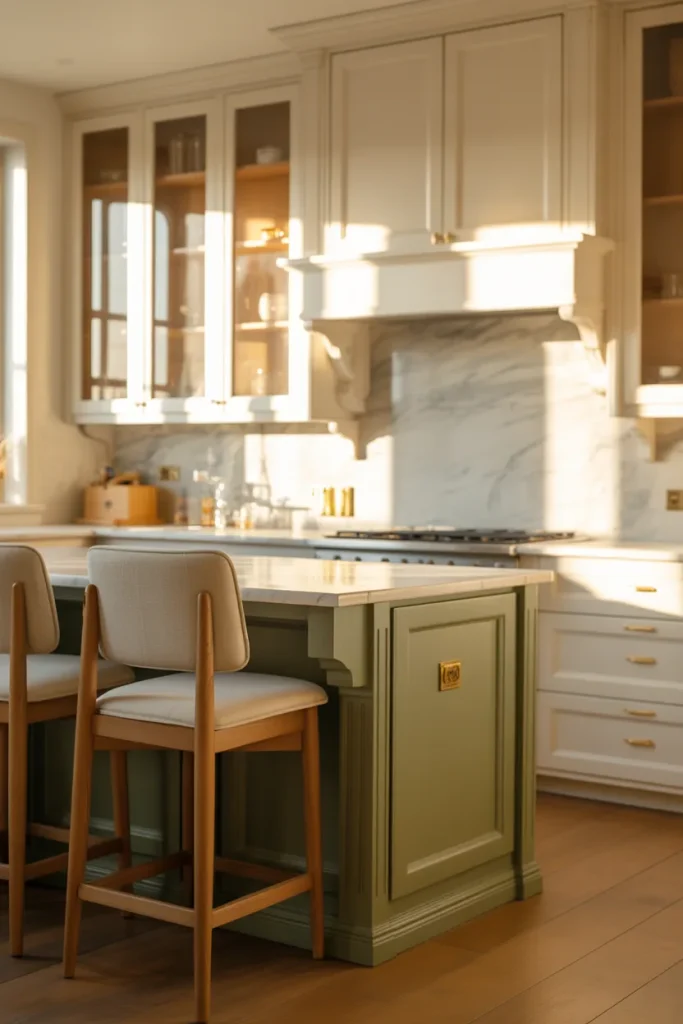 Adding Sage green to a central island gives the white kitchen of 2026 a grounded focal point. Pair white upper Cabinets with subtle Green undertones below, and finish with understated Decor like ceramics or natural linens. The effect is calm, layered, and quietly elegant.
