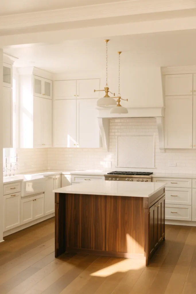 Rich Walnut and wood accents paired with crisp white create depth in the white kitchen of 2026. A warm wood island, structured Tiles on the wall, and balanced Design elements elevate the space. Add subtle Backsplash texture to prevent the white from feeling one-dimensional.