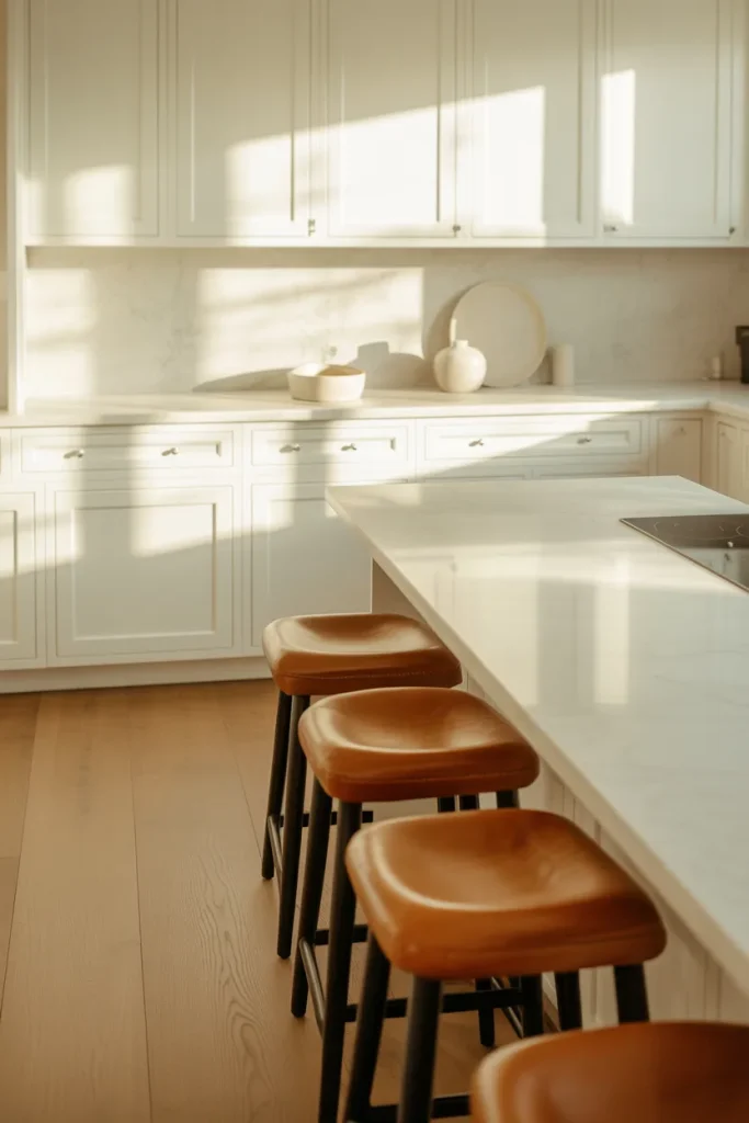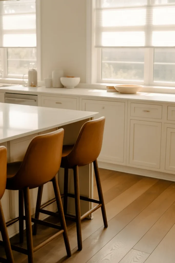 Budget-wise, this look doesn’t require a full remodel. Swapping in new stools, adding wood accents, or painting the island can shift the atmosphere without replacing every surface.