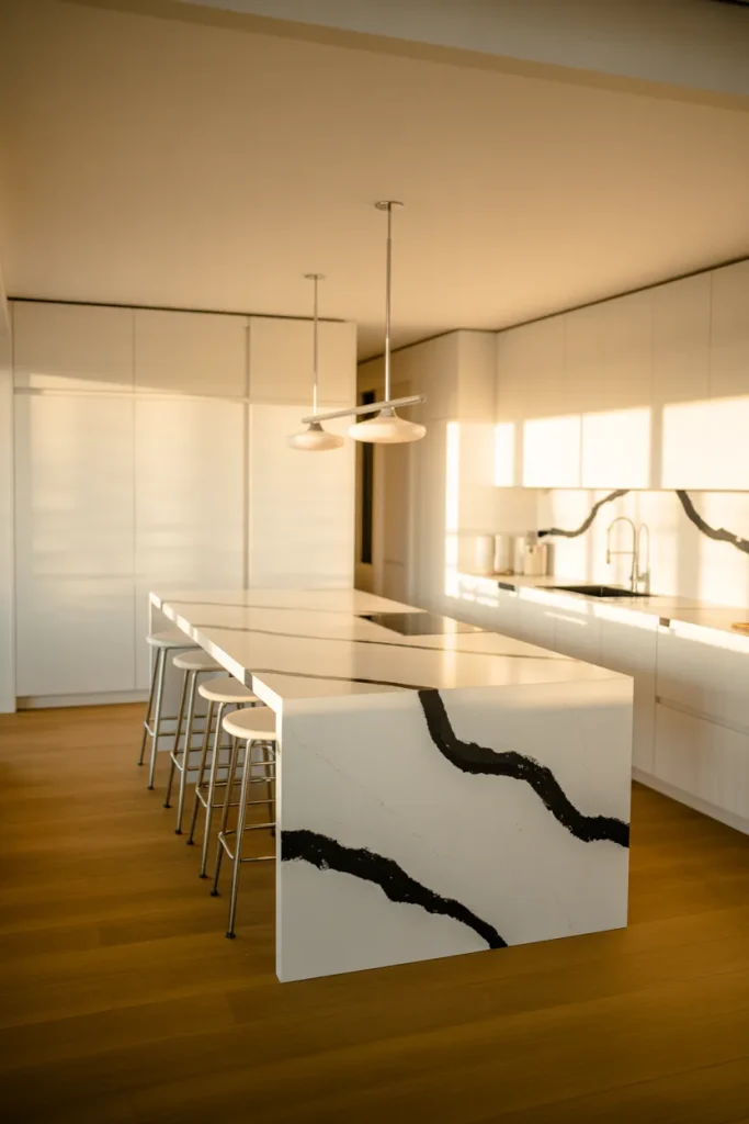 Sometimes the hero of white kitchen 2026 is the surface itself. Dramatic Countertops paired with crisp Cabinets can transform even a simple layout. A waterfall island in stone or quartz with subtle Black veining becomes the visual anchor.
